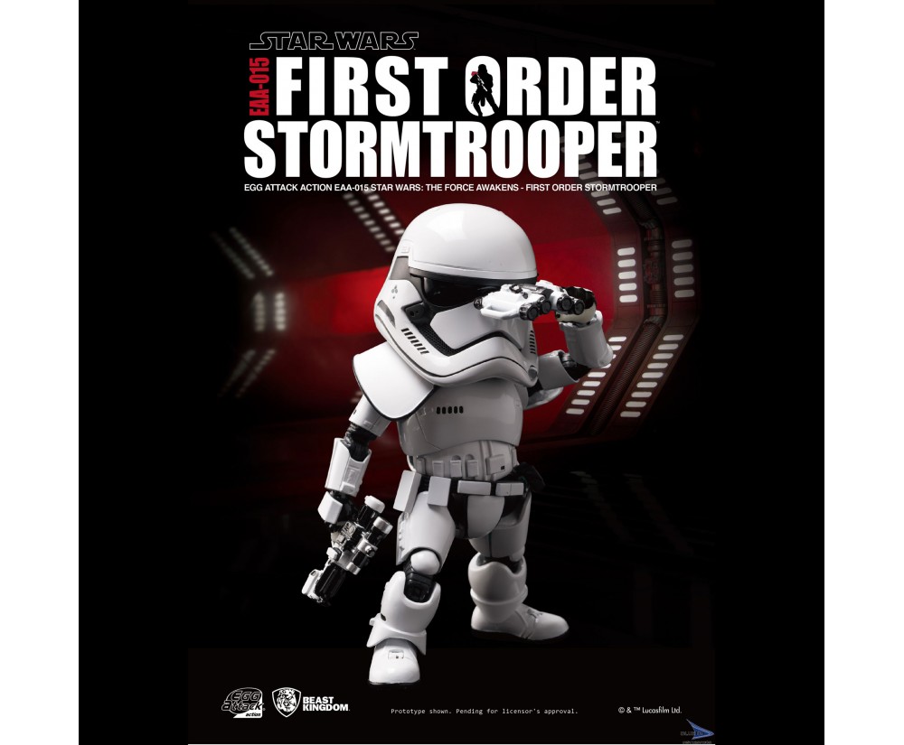 Beast Kingdom is proud to present the Egg Attack Action Star Wars Series' First Order Stormtrooper from Star Wars: The Force Awakens The 6-inch action figure is painted with expert technique, perfectly representing the texture of the Stormtrooper's white armor and new equipment (F-11 blaster rifle, SE-44C blaster pistol, and articulated binoculars) Each First Order Stormtrooper is shipped with two pauldrons, letting collectors create their own First Order Stormtrooper army