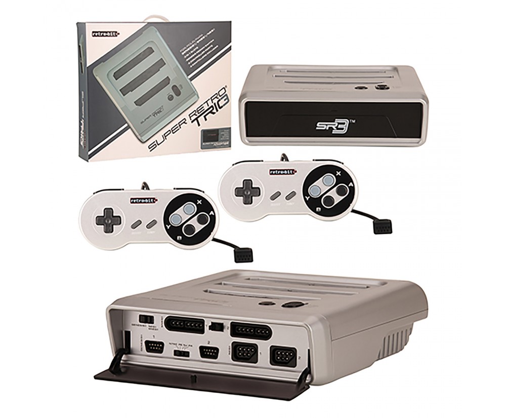 Nothing is better than the Super Retro Trio 3 in 1 Classic Gaming System. Play classic Original Nintendo , Super Nintendo and Sega Genesis games directly from the original cartridges onto the SR3 game console. This modern design of this 3-in-1 home retro console system allows for less clutter and more gaming anywhere. It is equipped with 3 cartridge slots for each classic system, 6 controller ports for using the Original Nintendo, SNES & Genesis controllers, 2 Retro Trio controllers, AV cable, S-Video connection and AC adapter. The SR3 gives every old-school gamer a new reason to get their game on!