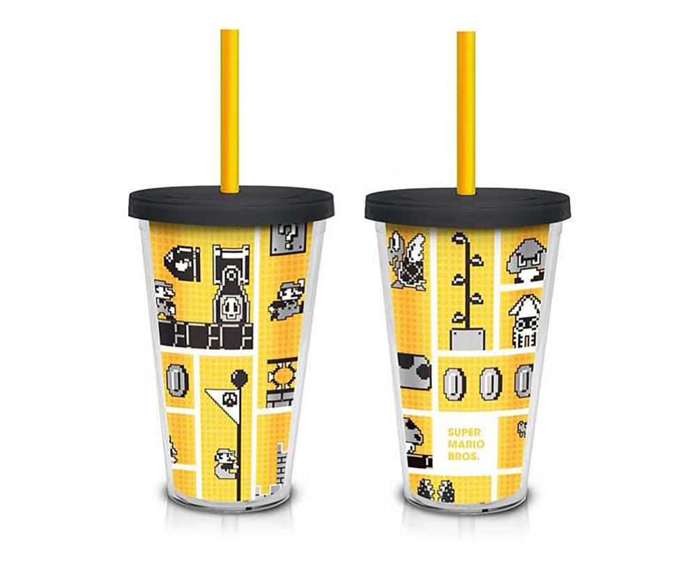 Super Mario Travel Cup, officially licensed. Features a unique design. Includes lid and a straw. Hand wash. Do NOT microwave. Dishwasher is not suitable. 16 oz.