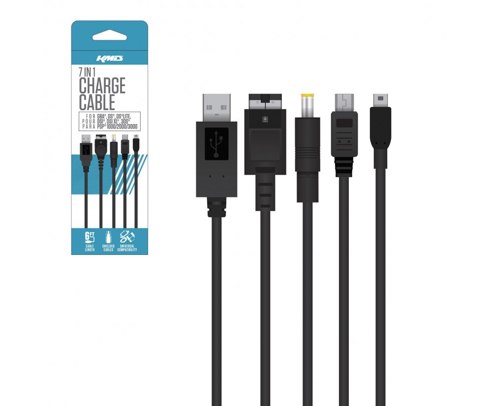 Get organized with KMD®'s space saving 7 in 1 Portable Charge Cable! Never worry about having to charge your GBA®, DS®, DS Lite®, or PSP® again! Compatible with GBA®, DS®, DS® Lite, DSi®, DSi XL®, 3DS® and PSP® 1000/2000/3000 Professionally crafted and shielded Cable length: 6 feet