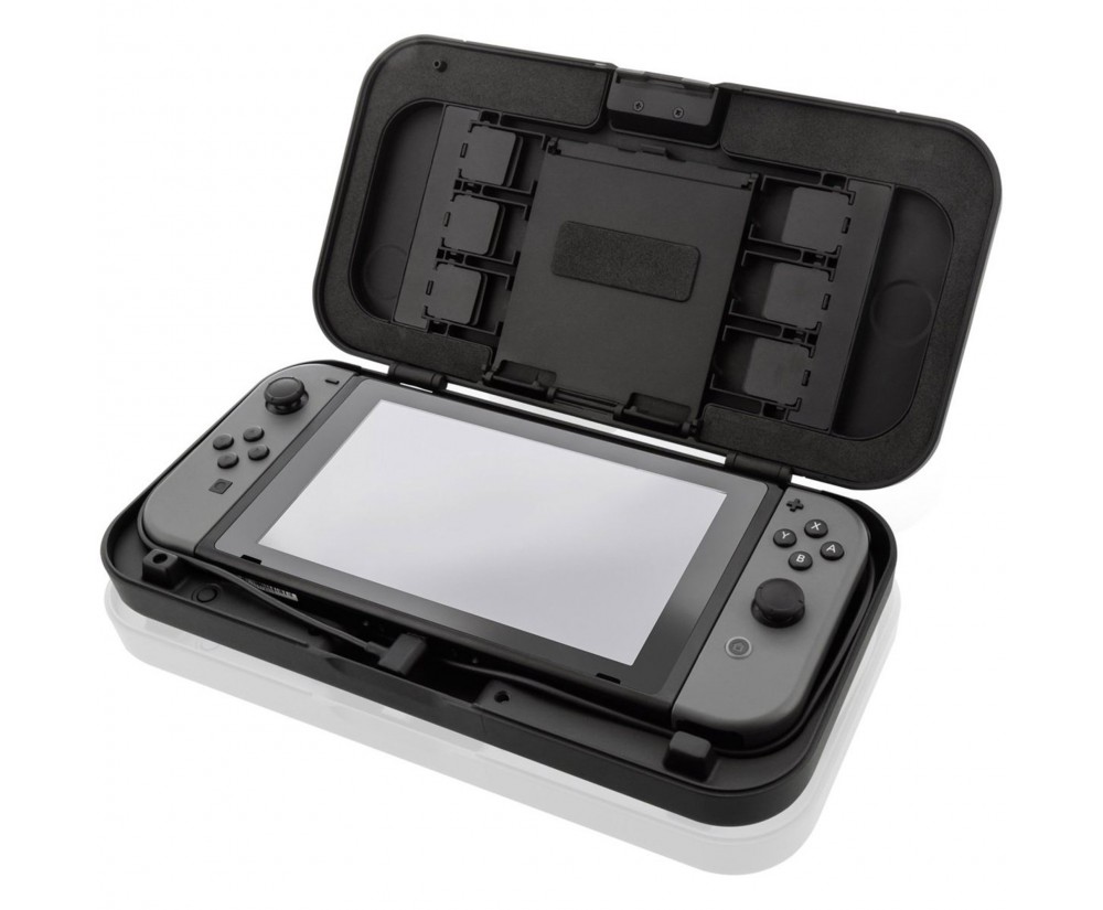 Conveniently store and charge the Nintendo Switch console – 6000 mAh battery: 5V, 2A Plug in the Type-C cable to recharge the battery for the Nintendo Switch Foldable case creates a kickstand. Can remove the kickstand for independent use Store up to 16 games or 15 games and 2 micro-SD cards