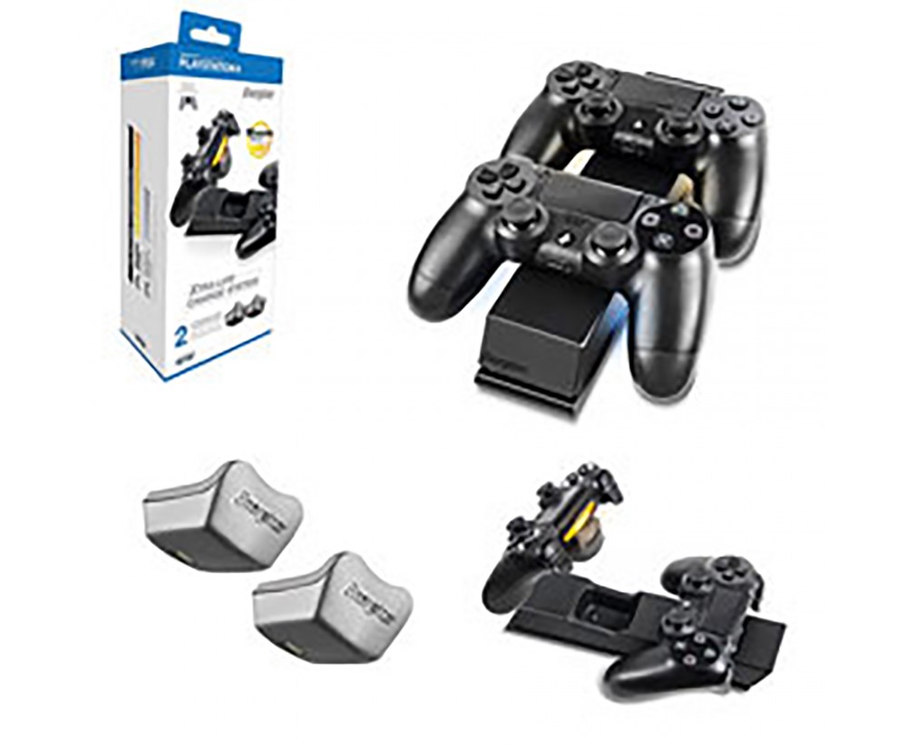 Charges Two PS4 Remote Controllers With the Extra Life Charger from Energizer for PS4, it is possible to charge up to two PS4 controllers simultaneously. Ready to relax for a whole night of uninterrupted gaming with the Energizer Extra Life Charger for PS4? Weve got you covered. Includes EnergizerPS4RechargePacks. With the included EnergizerPS4RechargePacks that provide long-lasting power, you'll be able to keep your controllers working longer. With glowing ports, you can check on the charge status for your controllers. Comes complete with AC adapter. This Energizer PS4 charger comes with a AC adapter that allows for quick charging.