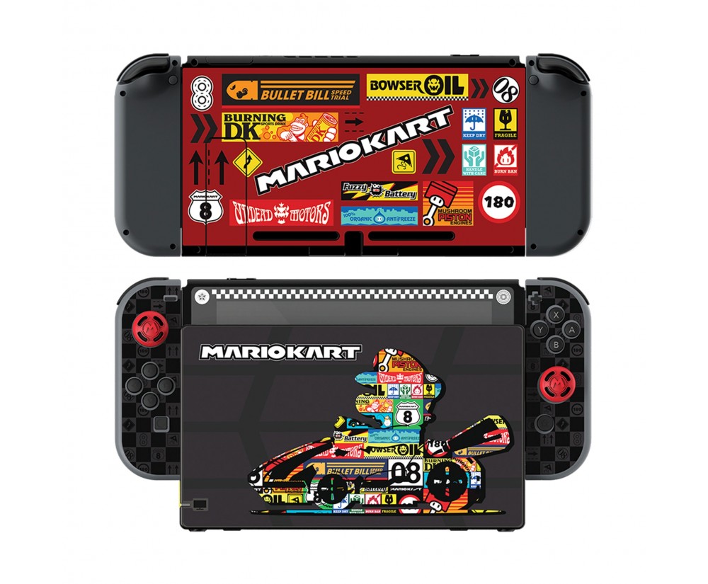Mario Kart Play and protect Skins for Nintendo Switch will show you are ready to race. These premium vinyl Skins add style and protection to your console and dock. Included is a themed screen protecter and rubber thumbcaps to help grip those tight corners!