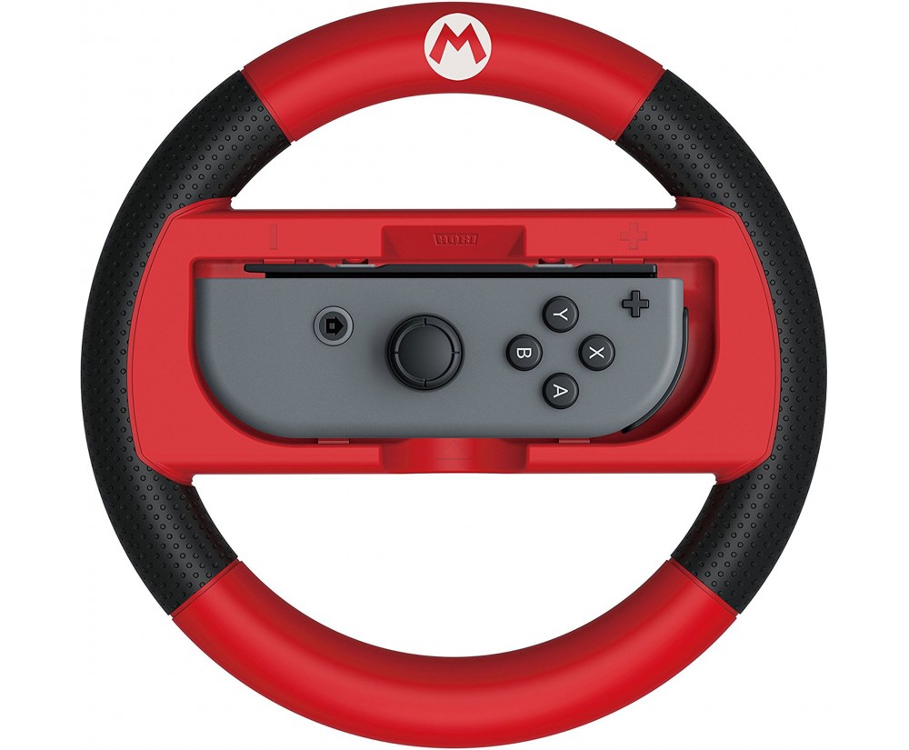 The Mario Themed Racing Wheel is an attachment for the Switch's Joy-Con. *Wide diameter wheels *Rubber grips and shoulder buttons for comfort & control *Optimized & designed for Mario Kart 8 deluxe for Switch. *Officially licenced by Nintendo