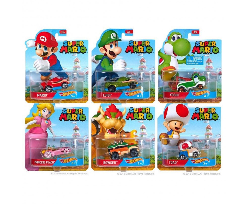 Hot Wheels Super Mario Brothers Factory Seal 8 Piece Case. Includes Princess Peach and Bowser. Also includes Mario, Luigi, Yoshi, Toad. Officially Licensed.