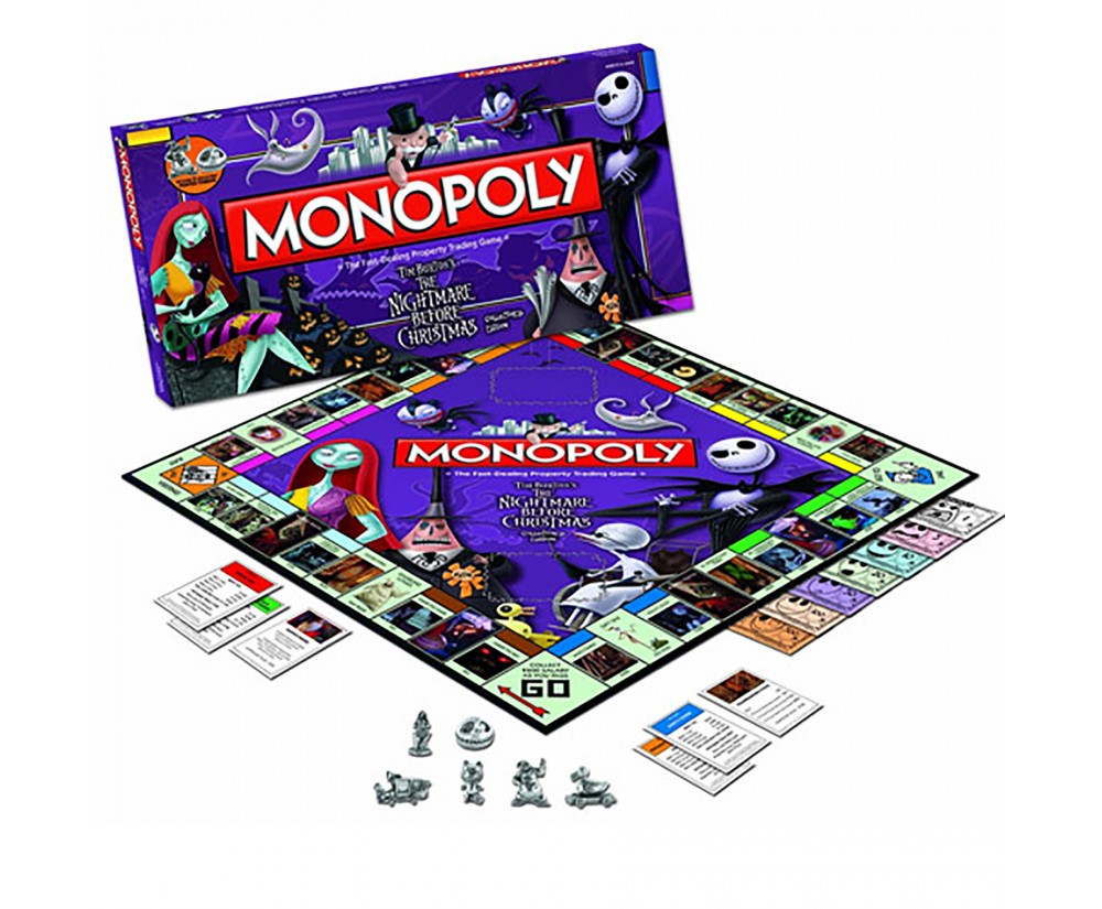 The Nightmare Before Christmas MONOPOLY Collector's Edition, featuring the infamous Pumpkin king teaming up the America's favorite game. Relive this cult favorite as you trade, buy and sell iconic movie locales such as Jack's Tower. Dr. Finkelstein's Laboratories, Sally's Alleys, Town Square Fountains and Spiral Hill. This custom-made game comes with film photography as well as six collectible Pewter Tokens such Jack's Skulls, Sally's Alley, Mayor's Hearse Oogie Boogie Zombie Duck Evil Teddy. The Nightmare Before Christmas and MONOPOLY fans will love this game. Ages 8 - Adult 2-6 Players Monopoly the Nightmare before Christmas The Nightmare before Christmas Collectors Edition features film photography, six collectible tokens and the Nightmare before Christmas board game.